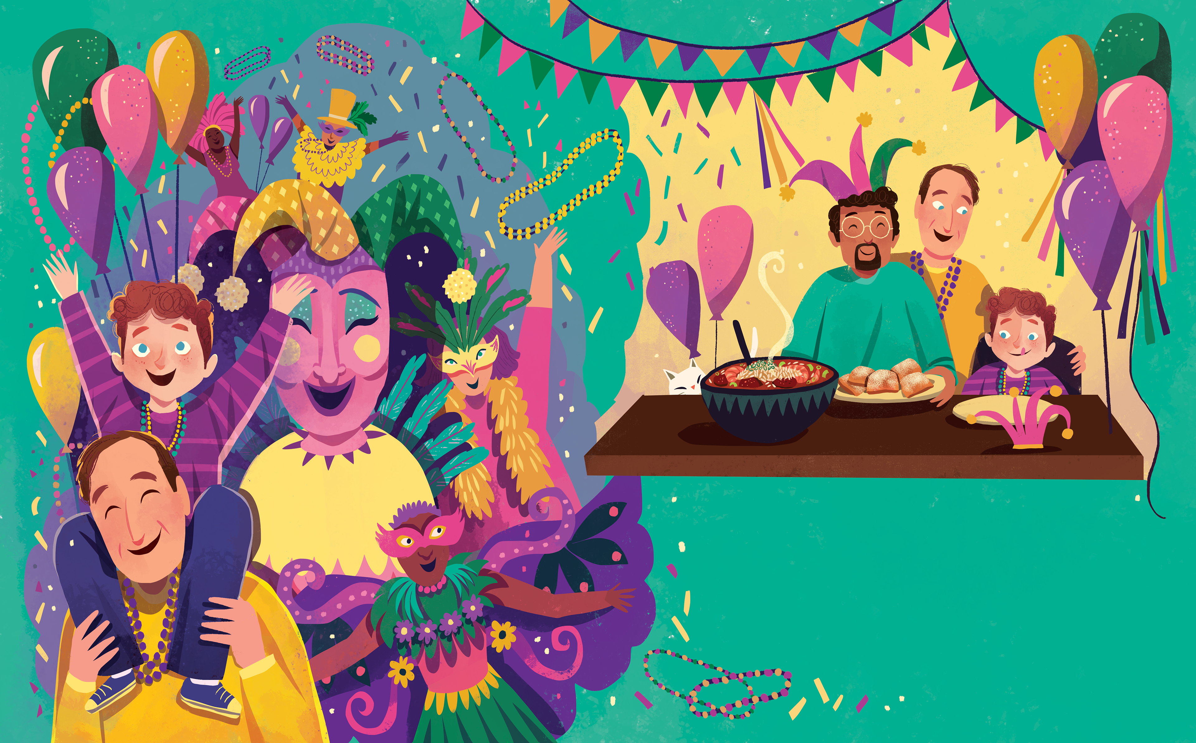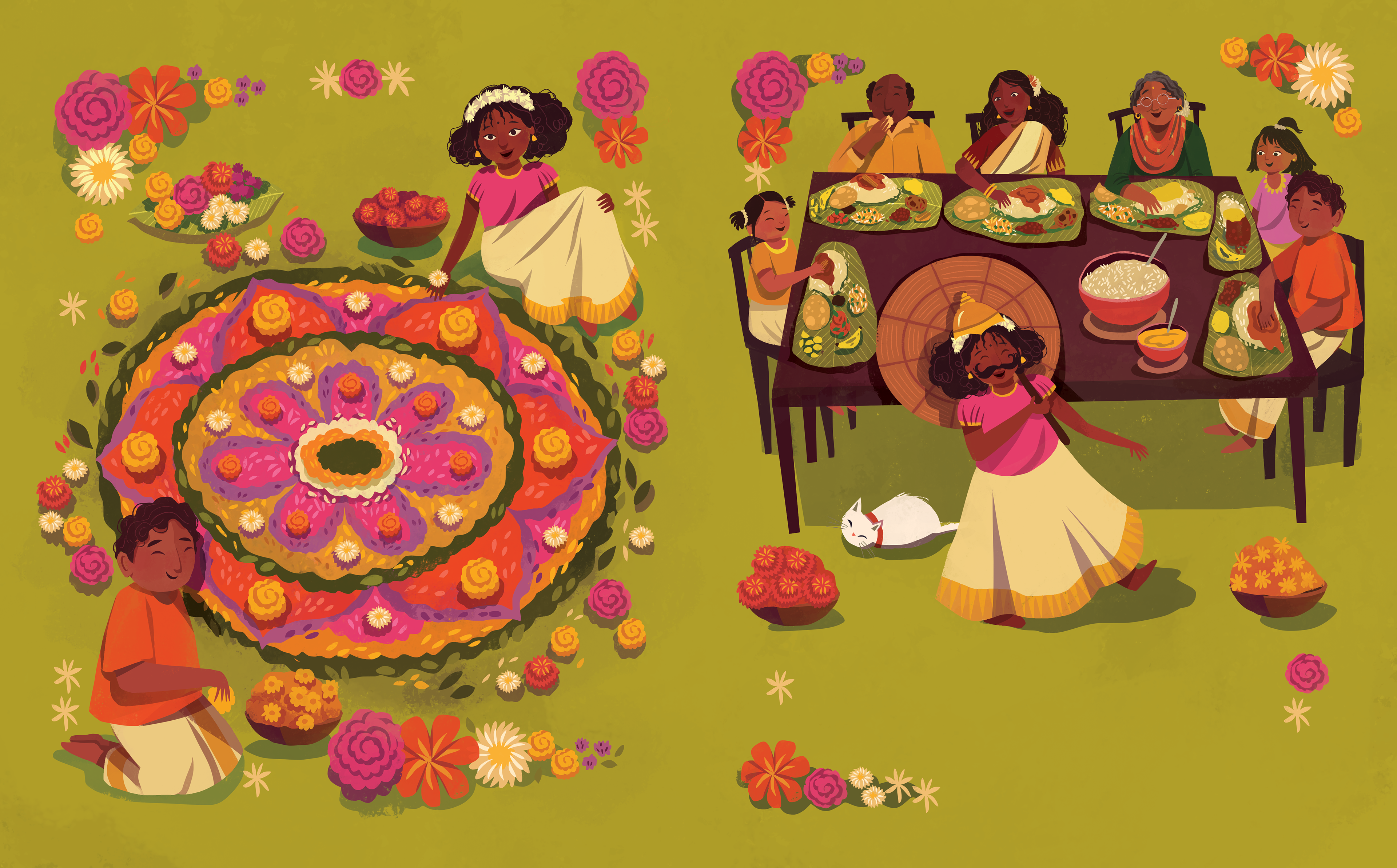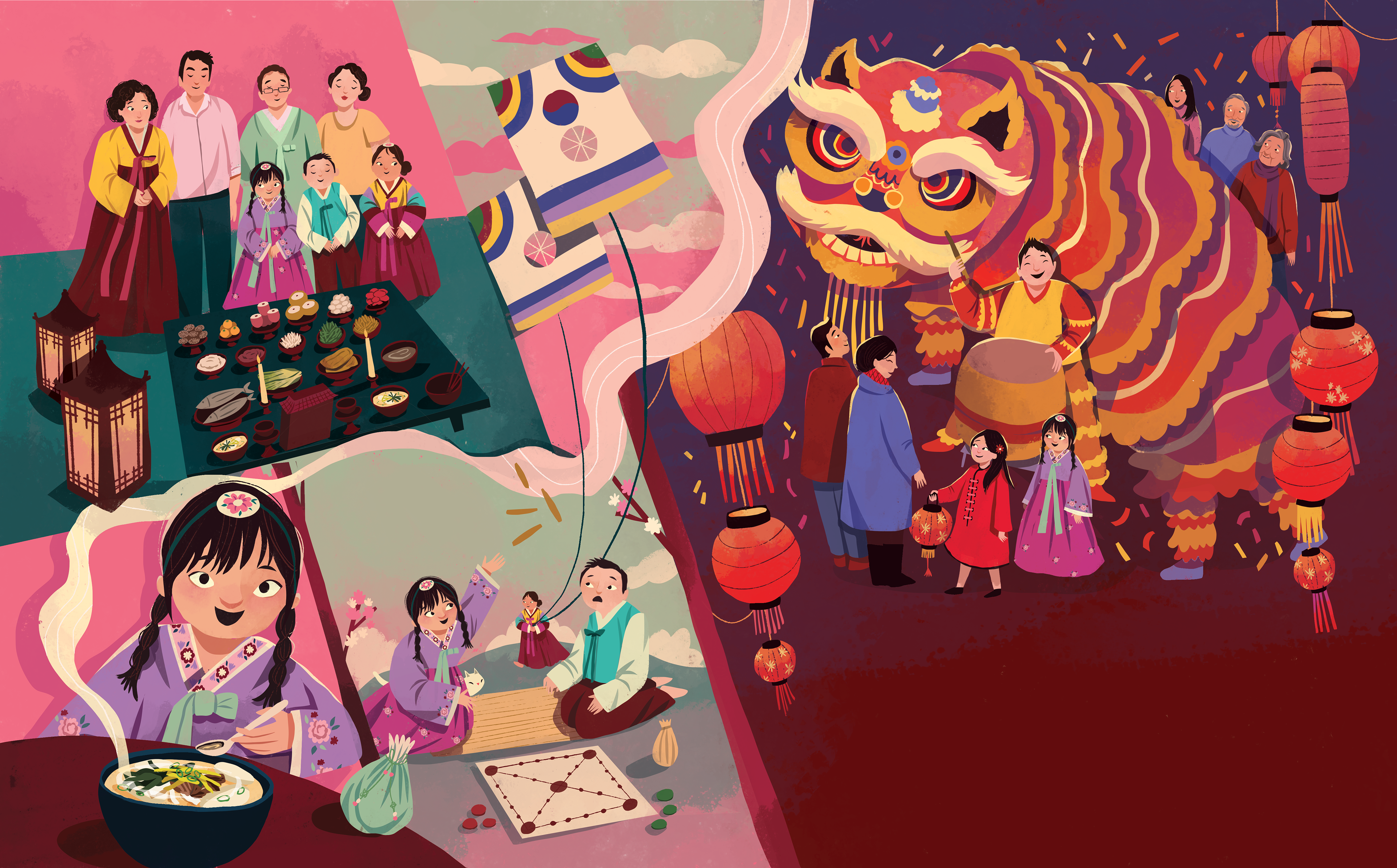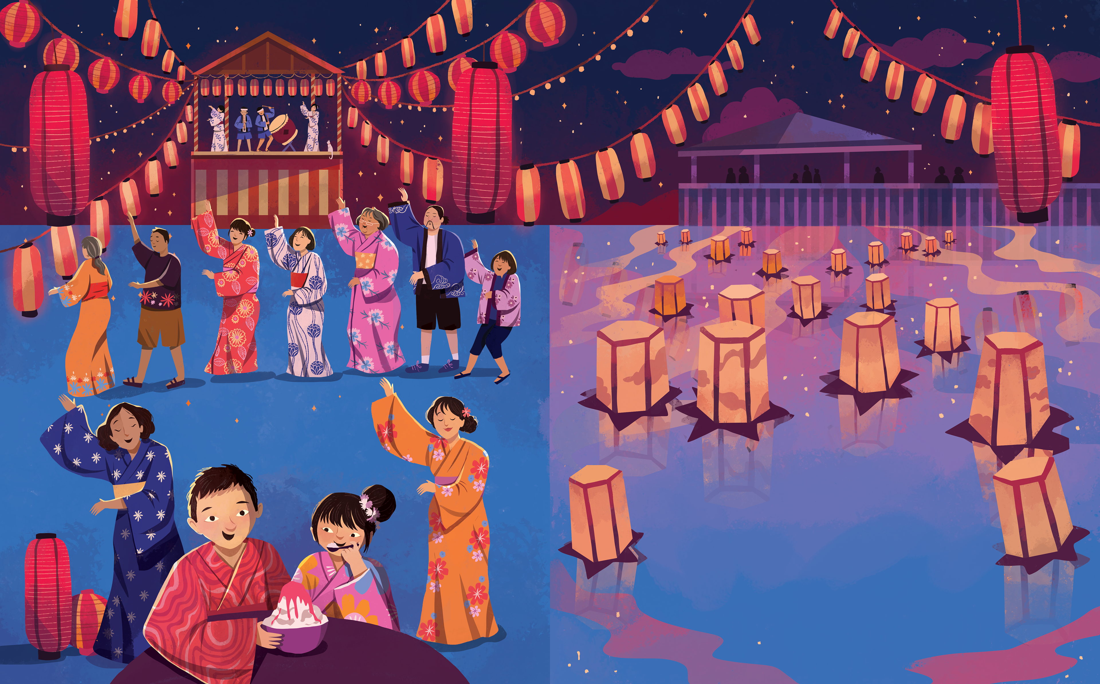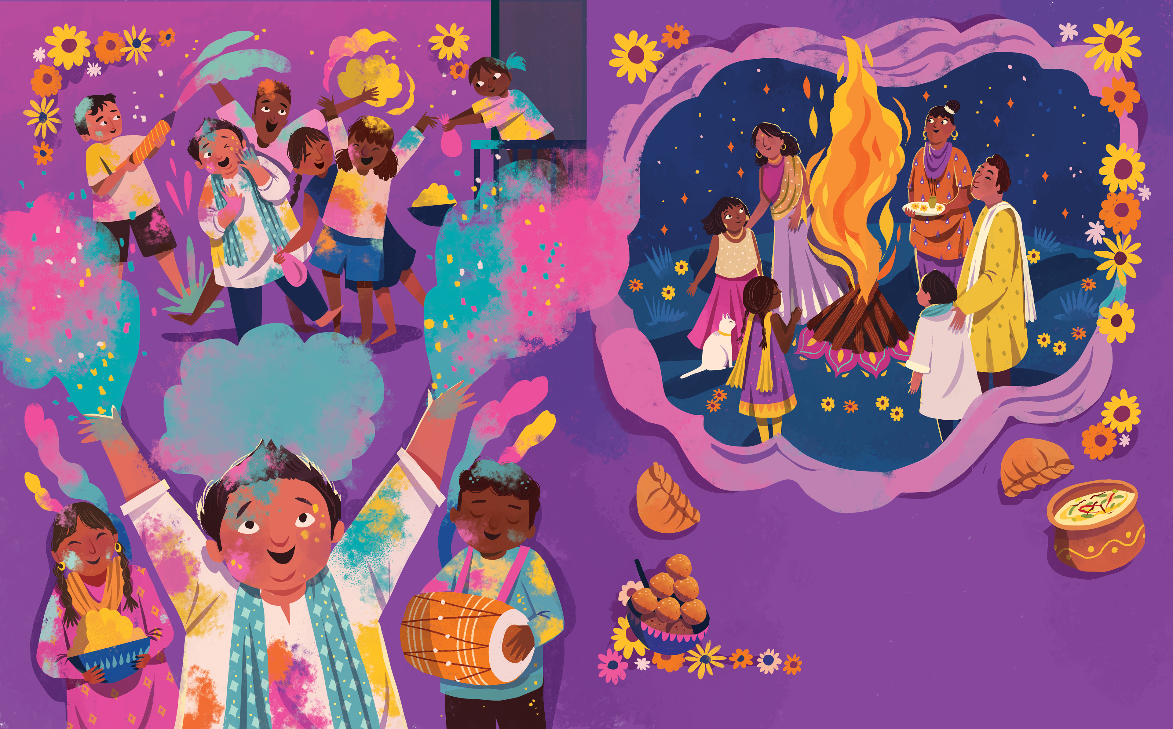 Illustrations for "Come and Join Us! 18 Holidays Celebrated All Year Long", a picture book written by Liz Kleinrock, and published by HarperCollins Children's books in 2023 about celebrations and holidays around the world.