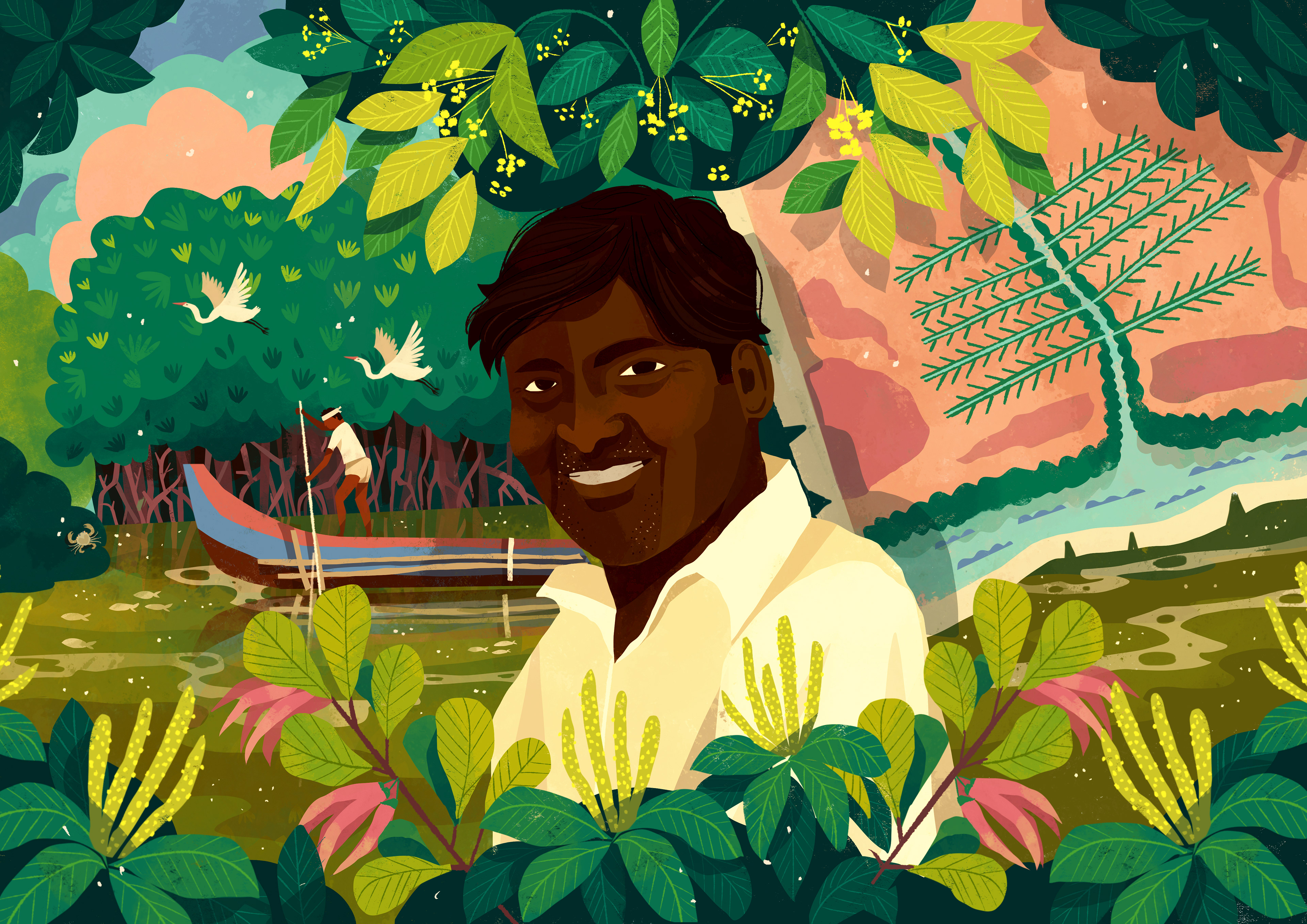Editorial Illustration for Mongabay India for an article about Sankar, a fisherman, who has mobilised his community and along with the forest department, they've dug canals for regular tidal flow, to preserve the mangroves of Muthupet.